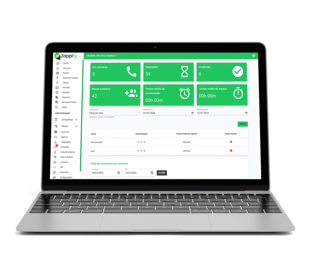 Tenha controle total do seu atendimento com um painel simples, visual e completo. Acompanhe conversas em tempo real, visualize métricas de desempenho, gerencie usuários e tome decisões com base em dados — tudo em uma interface intuitiva e fácil de usar.